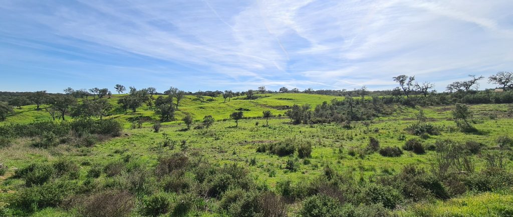 On emprunte sur plusieurs kilomètres un chemin en terre raviné par les dernières pluies et on finit par arriver sur le terrain de Green Oaks, chez Marie, en plein cœur de l’Alentejo.
