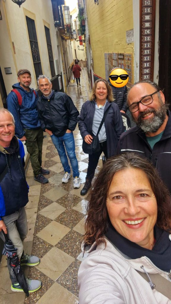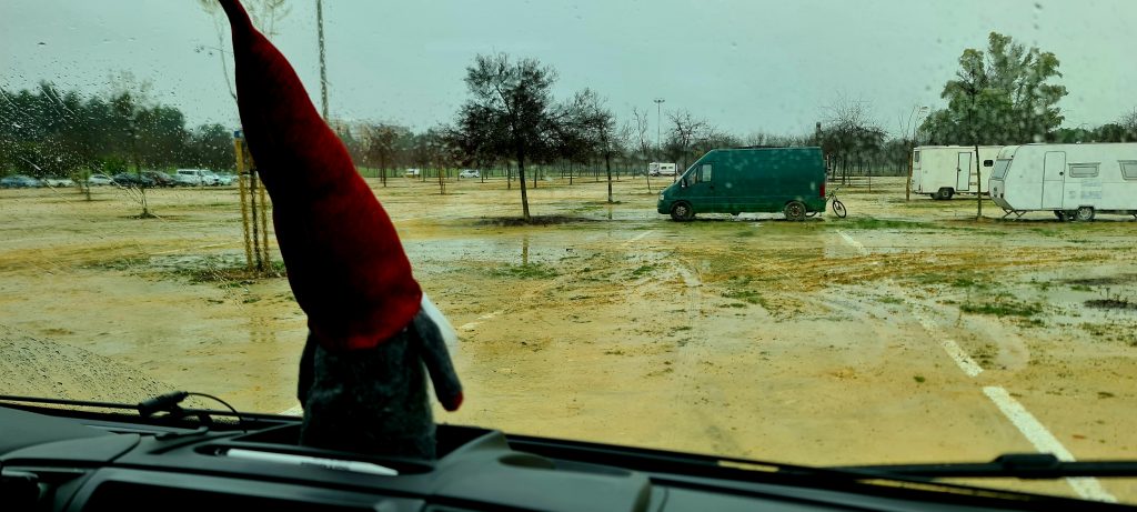 Problème du jour: la météo. Ou plutôt, l’absence totale de météo potable. Il pleut des cordes. Michel et Michel nous accueillent à bord du camping-car respectif de Michel (mais lequel donc?! Z’arrivez à suivre?!) avec un café bien chaud – un luxe absolu dans ces conditions. Et là, surprise: Mélanie et Uwe, un couple d’Allemands qu’on avait croisés quelques jours plus tôt lors d’une étape dans un superbe parc régional qui porte le nom de El Hecho, dans le secteur de Cordoba et qui font le tour du monde avec leur CC, débarquent à l’improviste. Après les retrouvailles on brave les conditions météo apocalyptiques et on part tous ensemble pour visiter Séville.