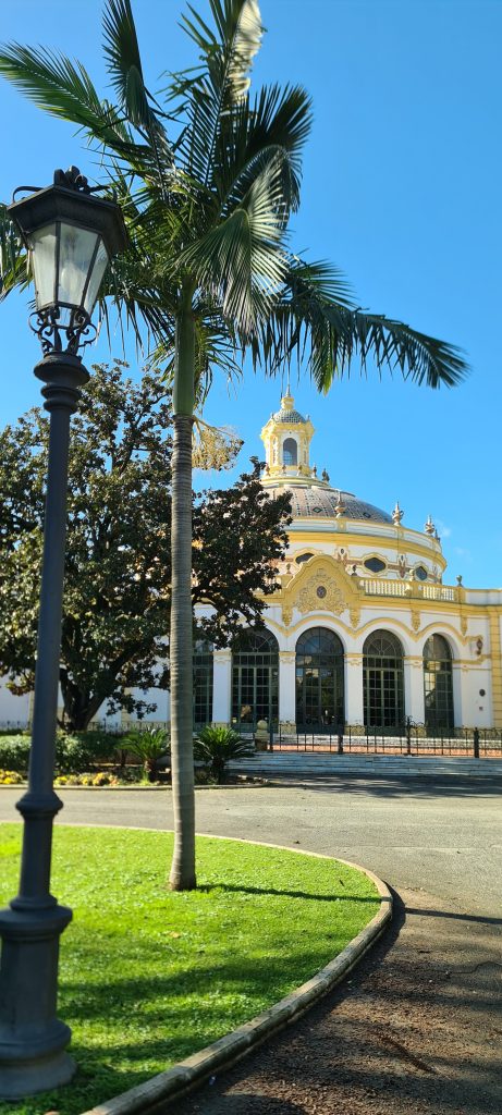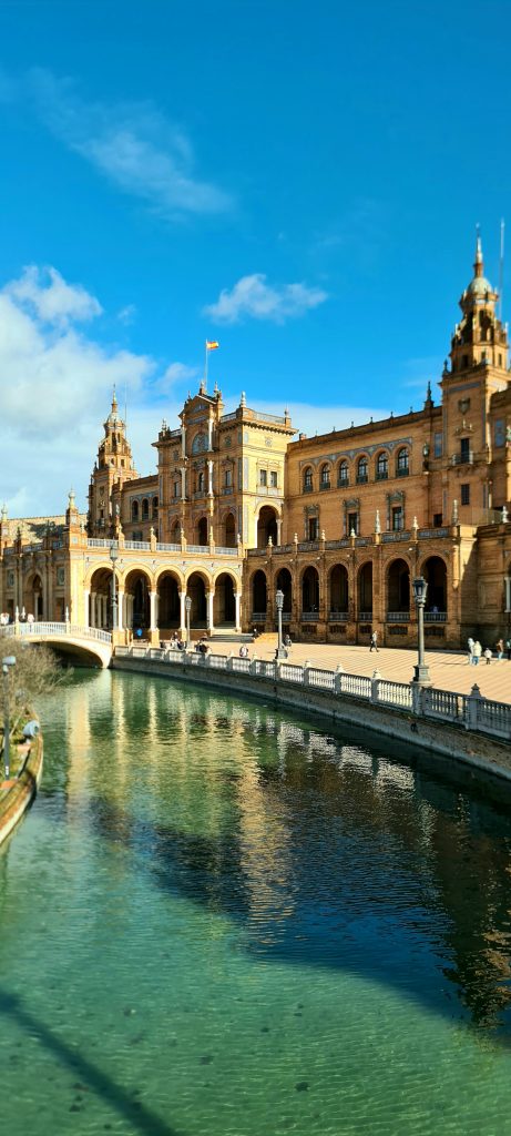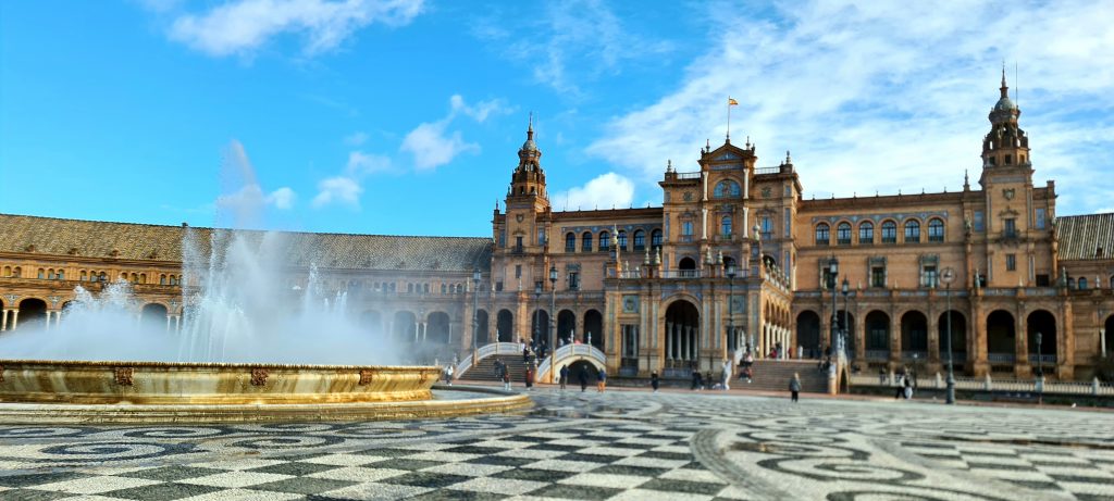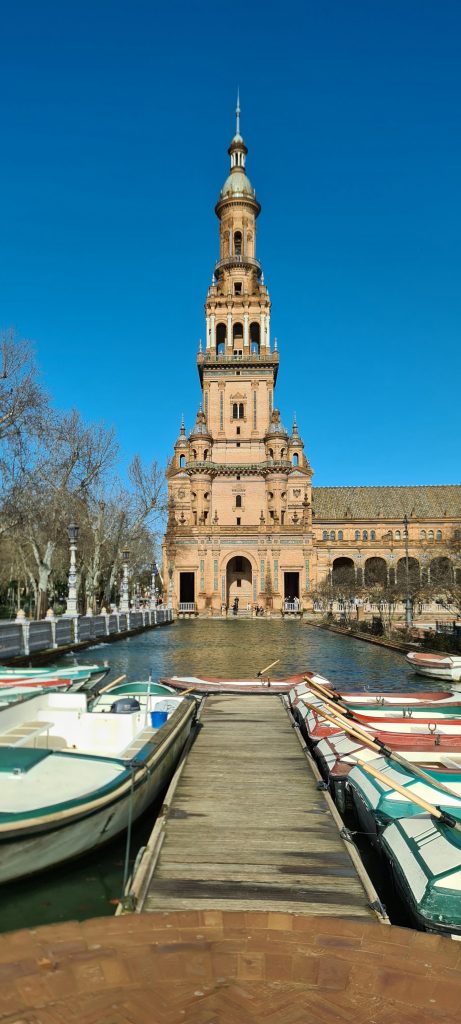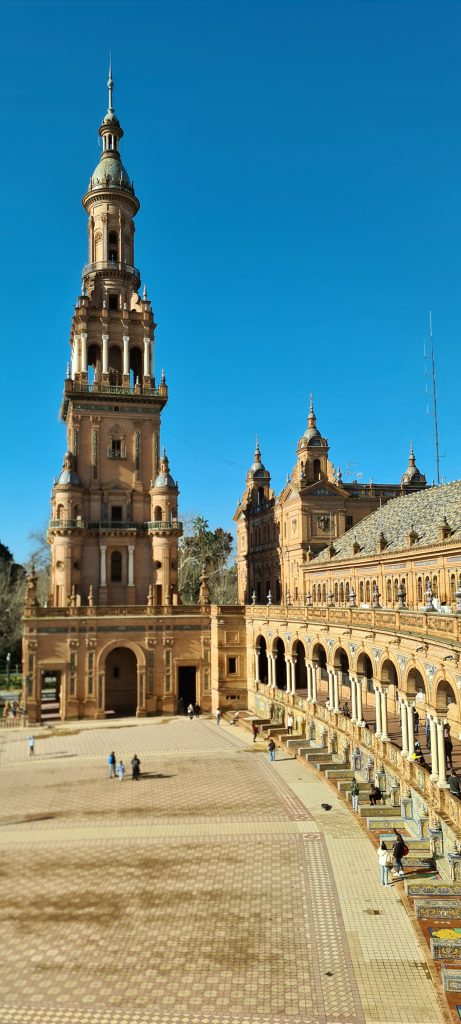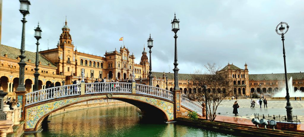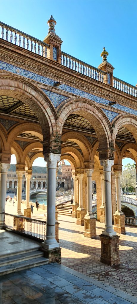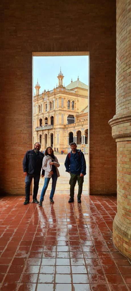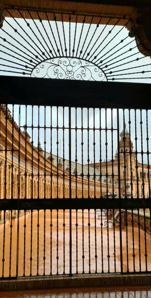 On ne pouvait pas louper la fameuse Plaza de España, une merveille née de l’Expo ibéro-américaine de 1929. Du marbre, des briques, des azulejos… le tout en mode grandiose. Parce qu’il y a quand même un truc en arrivant à Séville, il y a un instant où ton cerveau bugue : c’est celui où tu mets les pieds sur cette place! Ce n’est pas une simple place, c’est une démonstration de « Regardez ce qu’on sait faire ». Immense, majestueuse, entourée de ponts et de canaux, elle pourrait presque faire de l’ombre à Venise! On est trempés jusqu’aux os, mais ébahis.