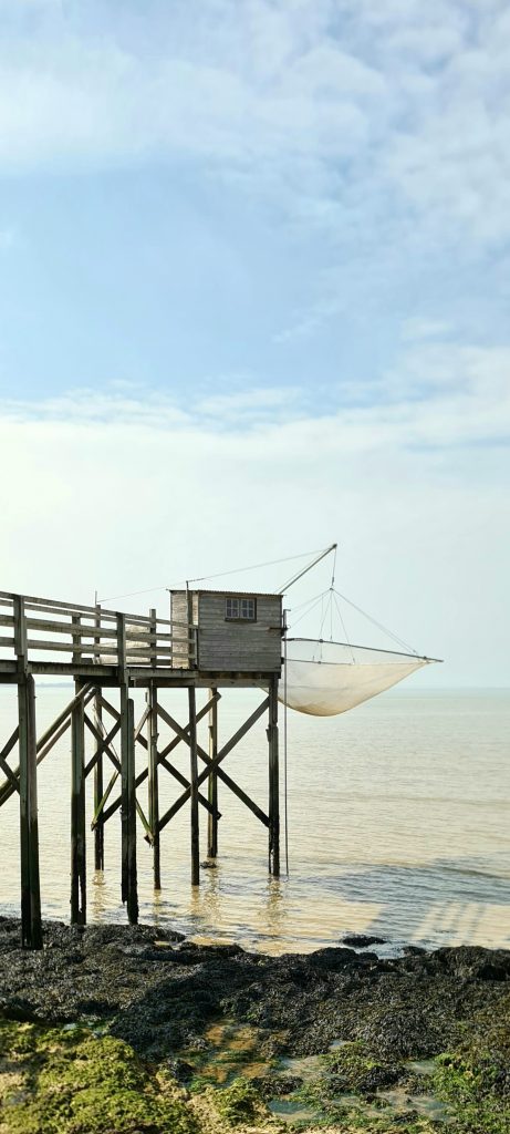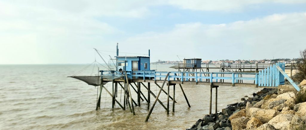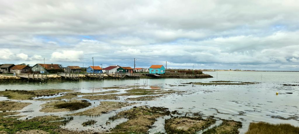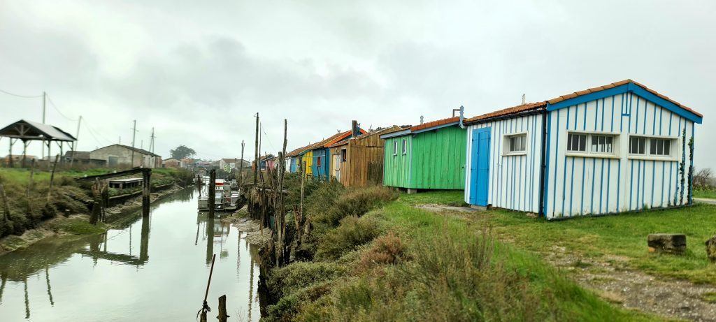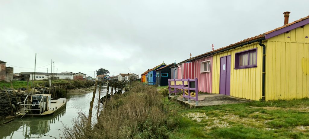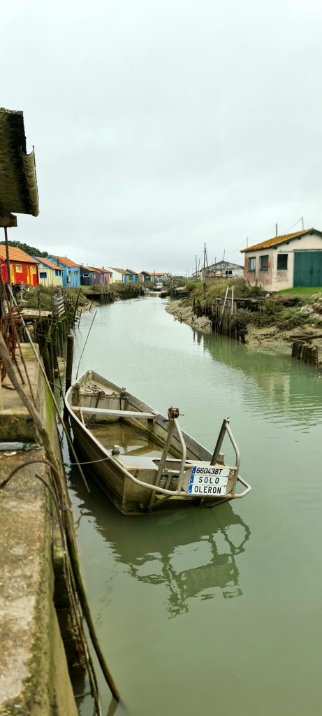 Le passage du grand pont se fait sous une bruine bien dégueulasse, du genre qui ne mouille pas tout de suite mais te transforme en serpillère humide après cinq minutes. Pas découragés pour autant, on enfile nos tenues de combat (imperméables et capuches vissées sur le crâne) et on part explorer les cabanes à huîtres de la Baudissière, à Dolus-d’Oléron. Ça sent bon le sel, la mer, et un peu l’huître en décomposition (on va pas se mentir), mais le lieu a un charme indéniable. Un alignement de cabanes colorées, sous le soleil cela doit avoir une autre gueule, c’est sur!